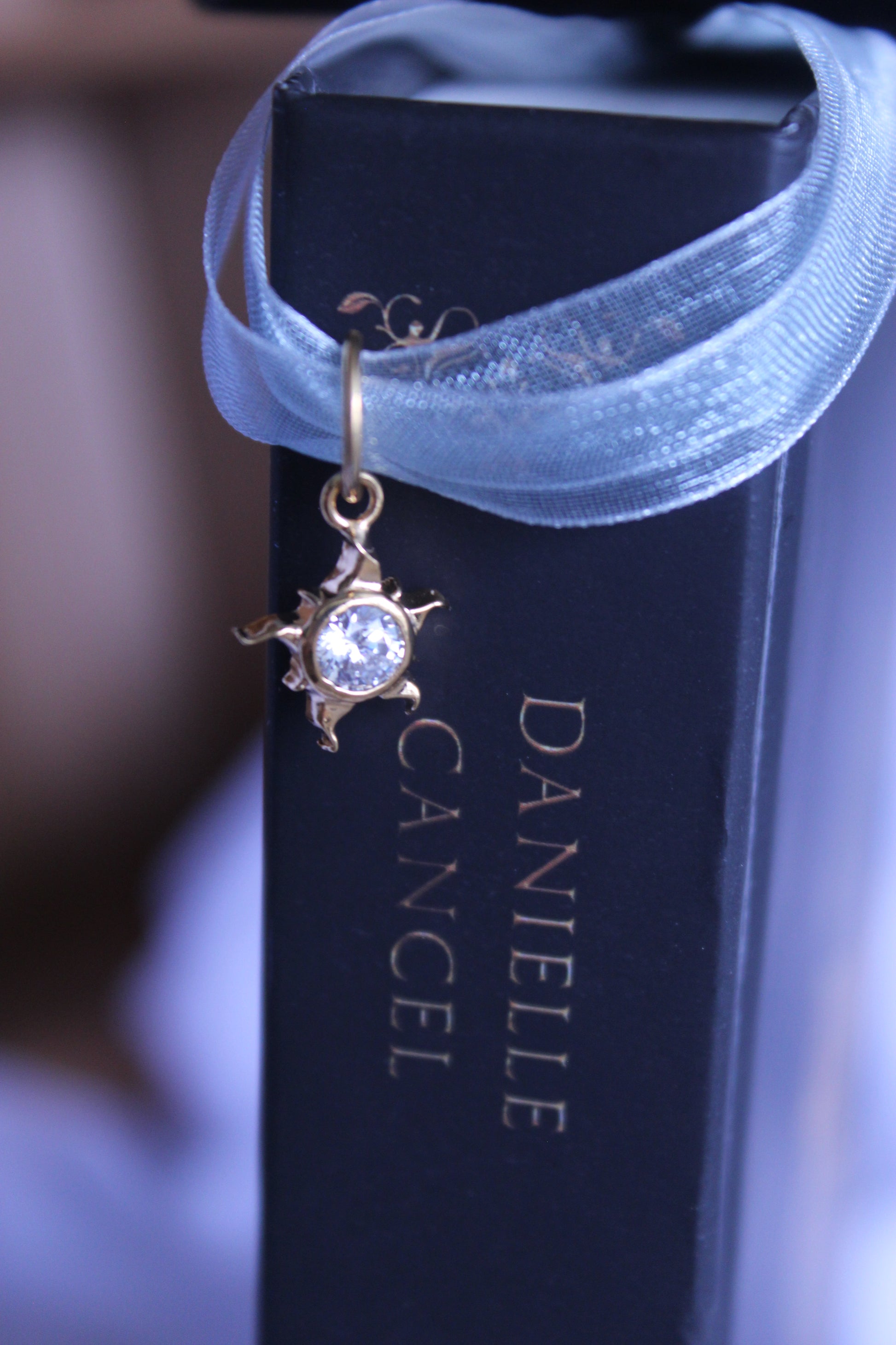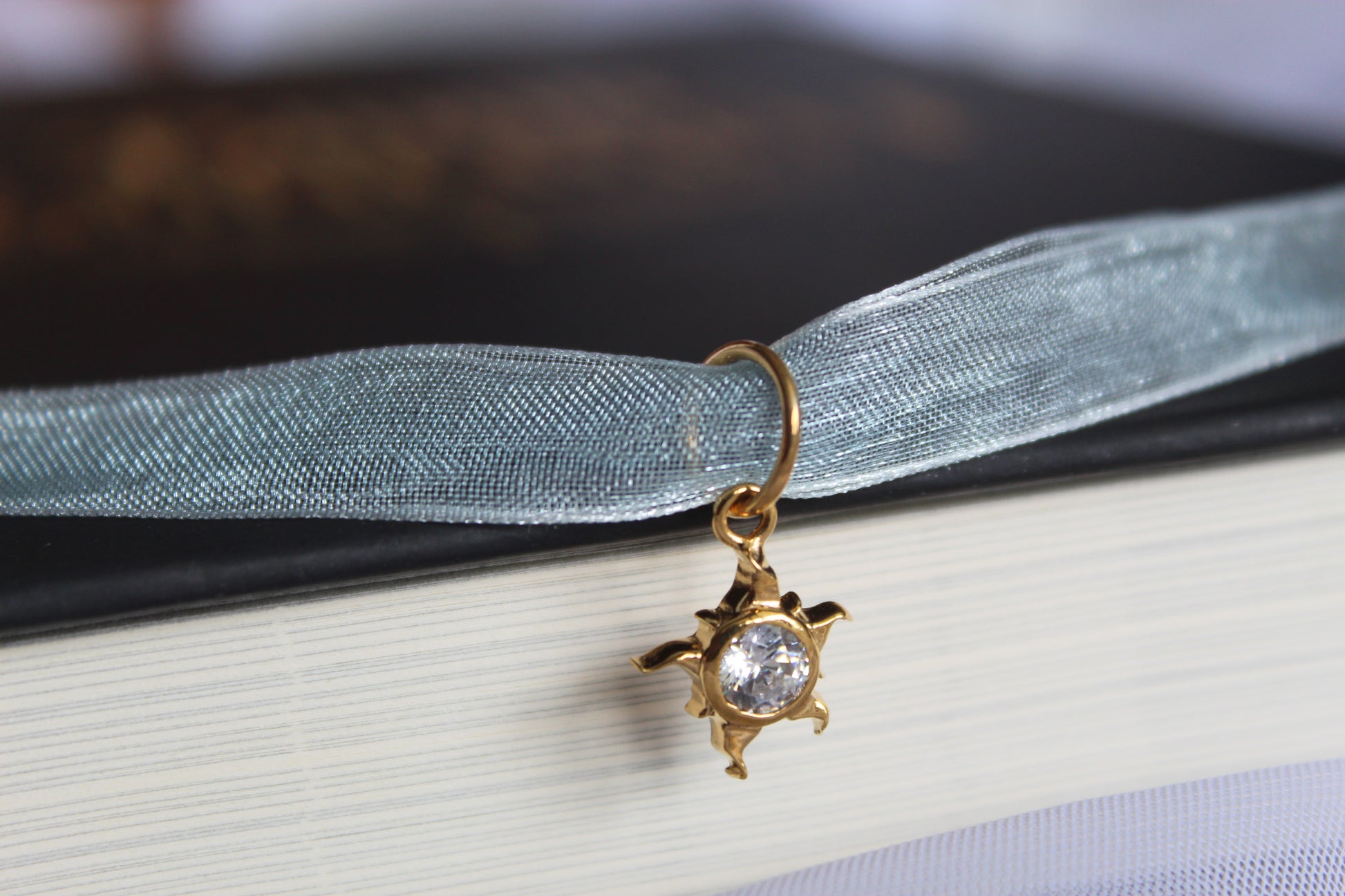 Step into the Twisted Fate Series with Jade's Choker Sun Necklace! This Sun pendant was specifically design by the Author herself, Danielle Cancel. It is made of Sterling Silver plated 14K Yellow Gold with a Cubic Zirconia center and placed on an adjustable blue ribbon choker. Will ship 7-10 business days after order.