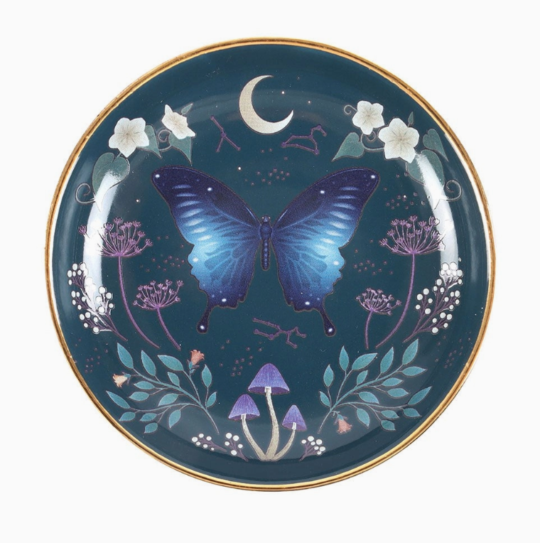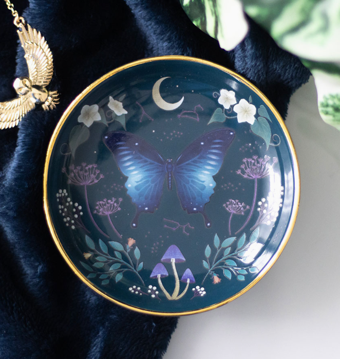 This enchanting trinket dish features a stunning midnight moth design in hues of blue inspired by the night sky. Delicate floral details and metallic gold edging will ensure this becomes a treasured accessory and decorative piece.