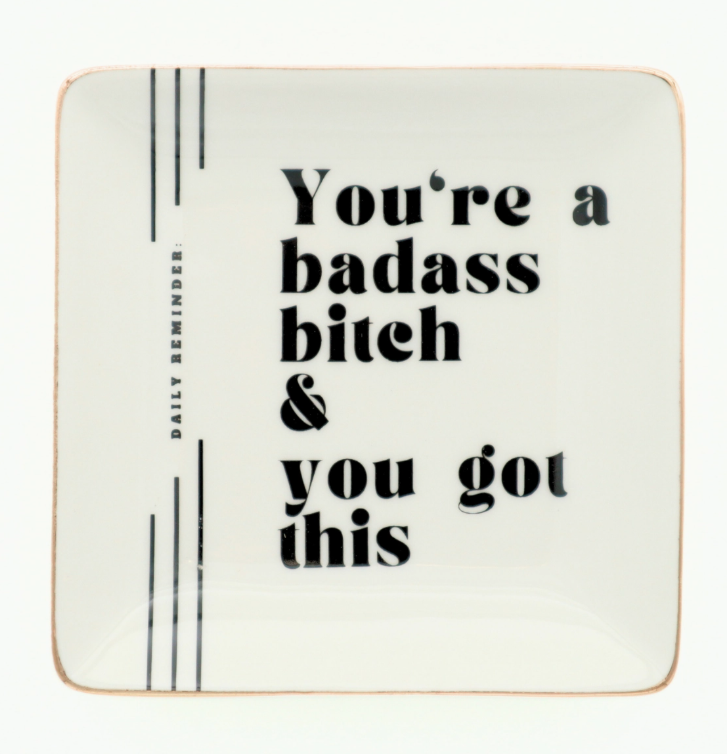 Daily Reminder: You're a badass bitch & you got this Ever feel like you need a quick motivational pick-me-up on your person at all times? Well, this affirmation trinket tray does just that... and is stylish too! Product Dimensions: 4.25" x 4.25" x .75"